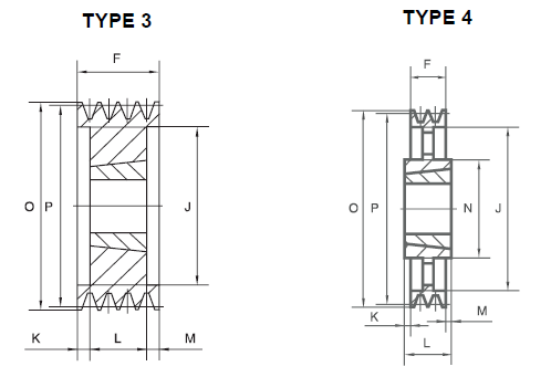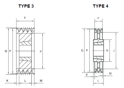| SPC/03 | Grooves | PCD | O.D | Type | Bush | Max Bore | E | F | J | K | L | M | N |