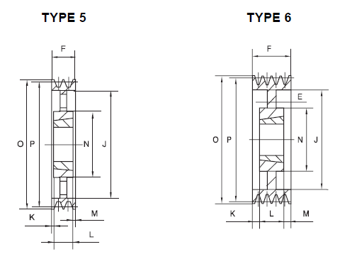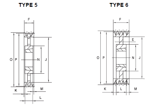 | SPC/05 | Grooves | PCD | O.D | Type | Bush | Max Bore | E | F | J | K | L | M | N |